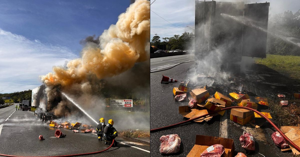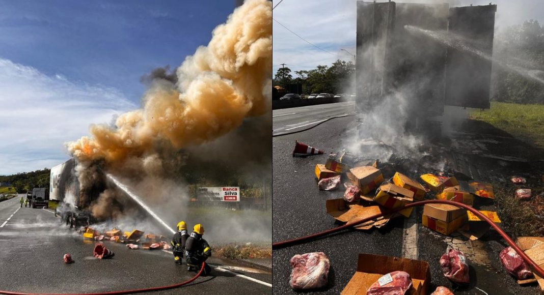 Caminhão pega fogo e carga com carne refrigerada é saqueada na BR-101, em Garuva