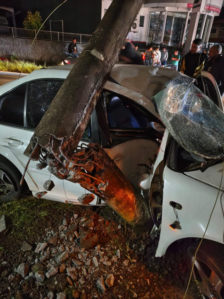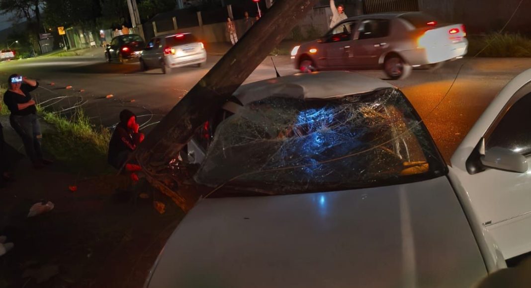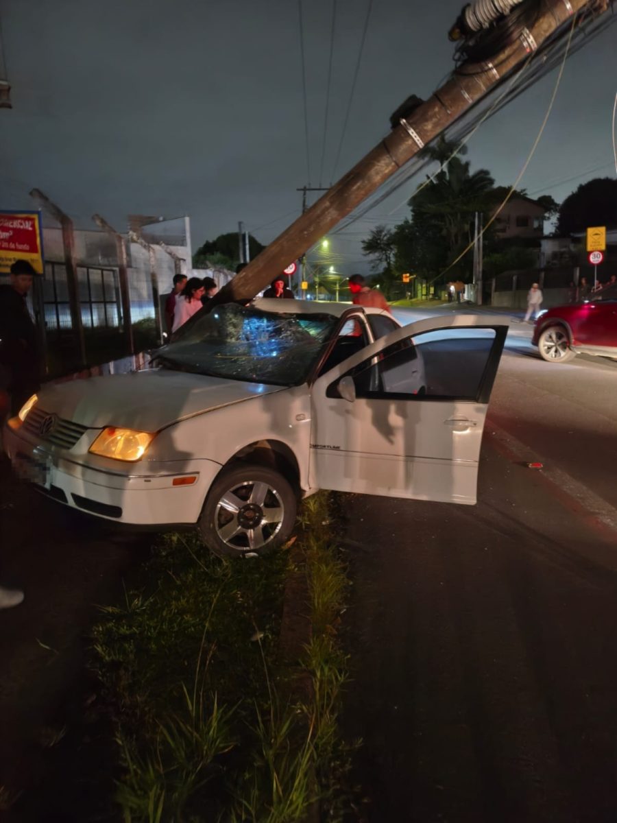 Um Volkswagen Polo branco colidiu contra um poste na noite de sábado, 27, na rua Tuiuti, no bairro Aventureiro, em Joinville.