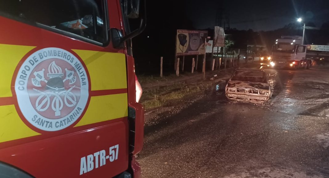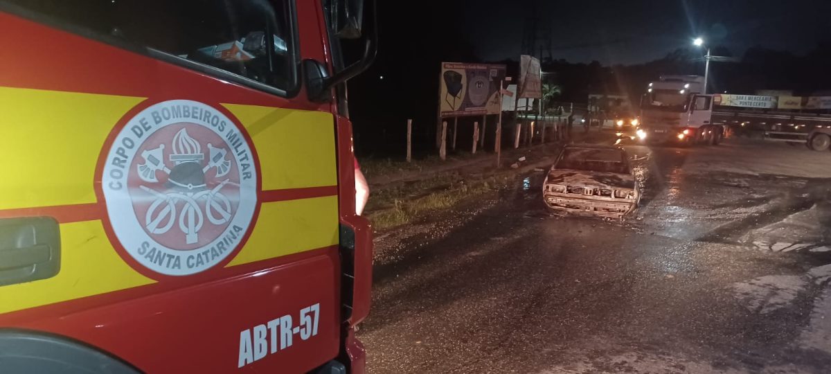 Um veículo de passeio ficou completamente destruído após pegar fogo na noite de quinta-feira, 16, na Estrada Geral do Porto Grande, no bairro Corveta, em Araquari. O incêndio ocorreu por volta das 22h55, próximo ao trevo de acesso à BR-101.