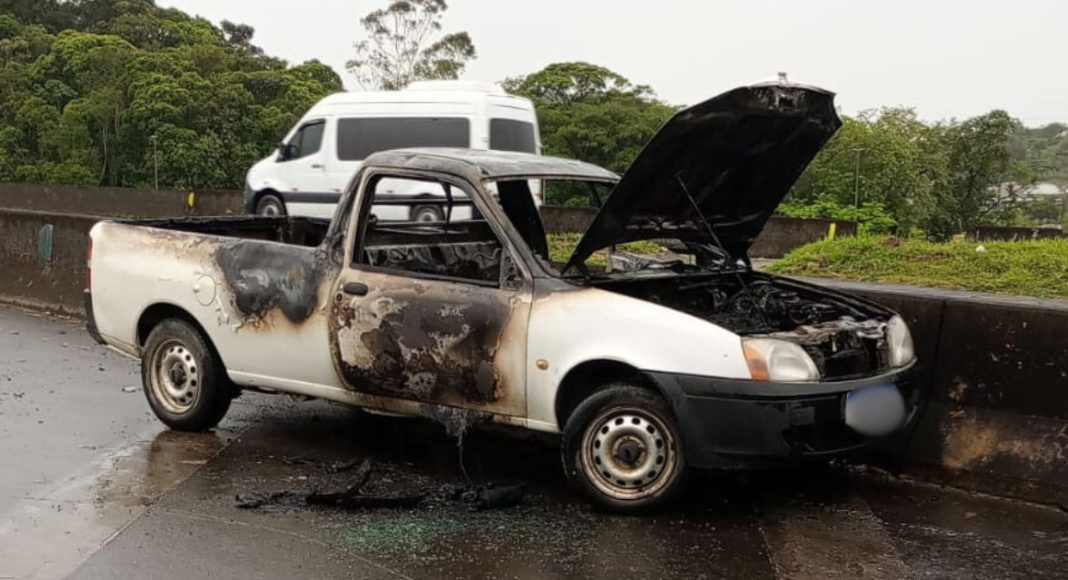 Um corpo carbonizado foi encontrado dentro de uma caminhonete que pegou fogo na manhã desta segunda-feira, 17, no km 49,6 da BR-101, no bairro Itinga, em Joinville.