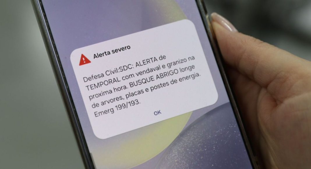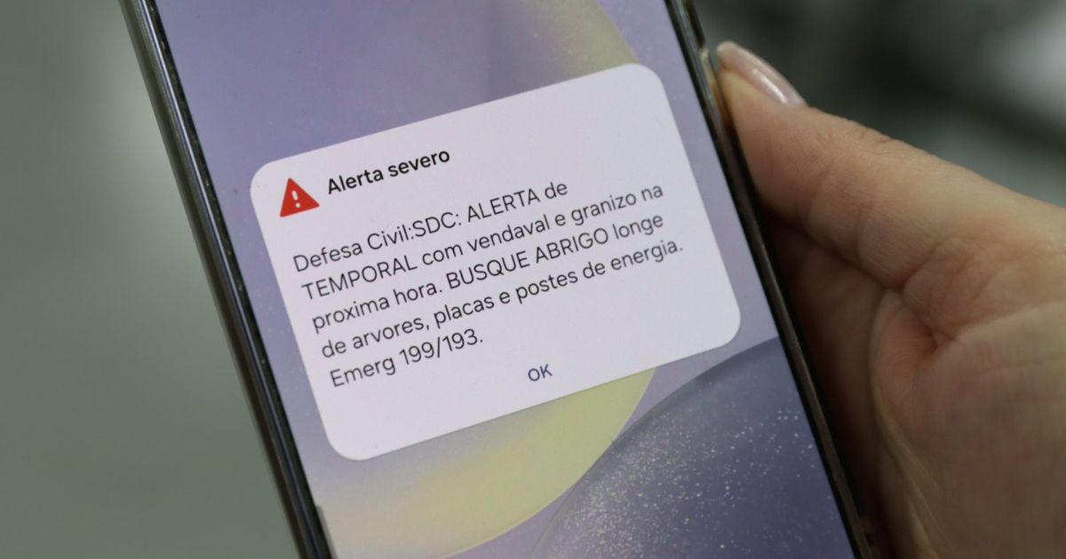 O aviso foi enviado por meio do sistema de Alerta Severo da Defesa Civil estadual, que dispara mensagens diretamente para os celulares conectados às redes 4G e 5G na área de risco.