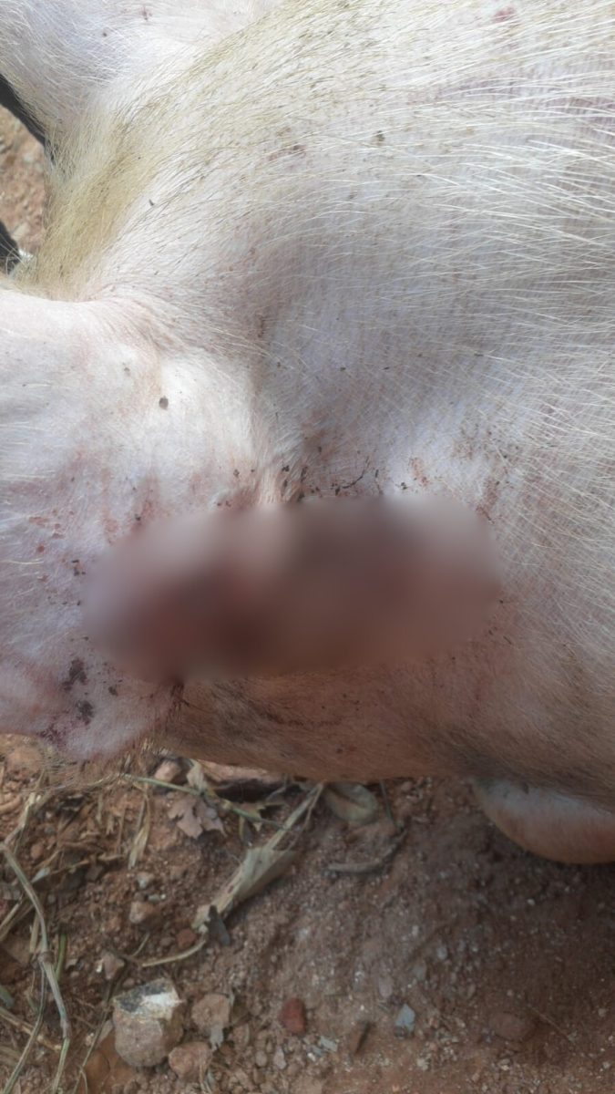 “Eles deram um tiro e cortaram a cabeça do maior, que tinha uns 300 quilos, mas ele se prendeu no eucalipto. Acho que não conseguiram tirar ele de lá. O outro, que também teve a cabeça cortada, deixaram no rancho do meu vizinho. Quatro que ficaram no chiqueiro foram esfaqueados quase por todo o corpo”, relata.