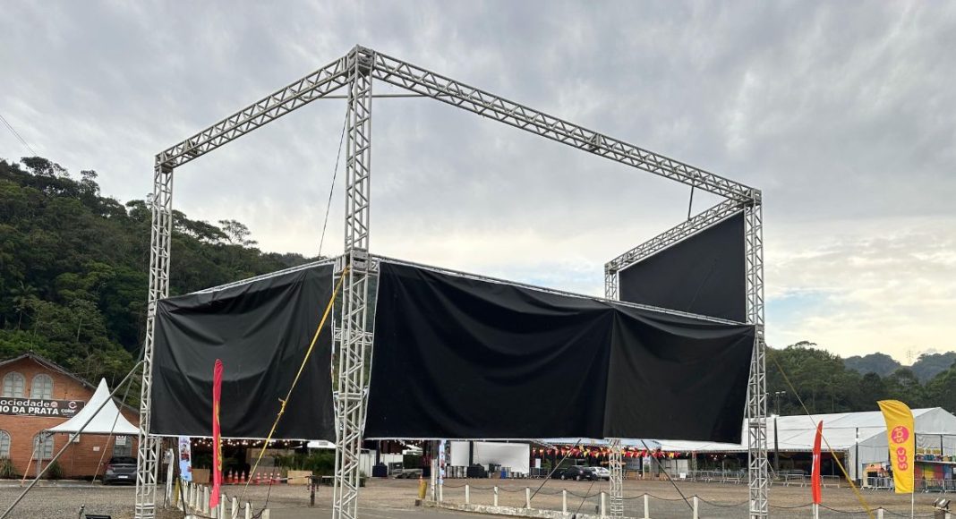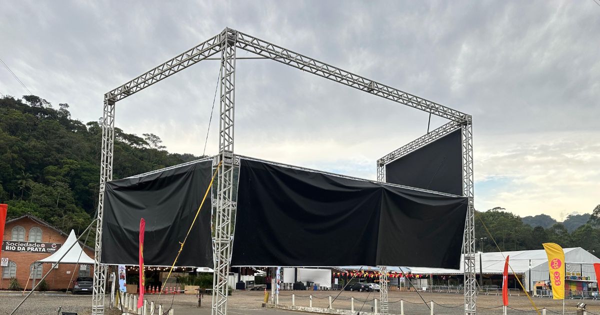 Ventos fortes que atingiram Joinville danificaram a fachada do portal de entrada da Fenachopp, que acontece na Sociedade Rio da Prata, no Pirabeiraba.