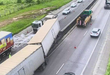 BR-101 é parcialmente bloqueada após carreta bater em mureta da rodovia, em Araquari