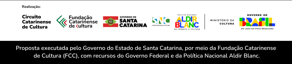 Esta ação cultural é executada pelo Governo do Estado de Santa Catarina, por meio da Fundação Catarinense de Cultura – FCC, com recursos do Governo Federal e da Política Nacional Aldir Blanc, por meio da Fundação Catarinense de Cultura.