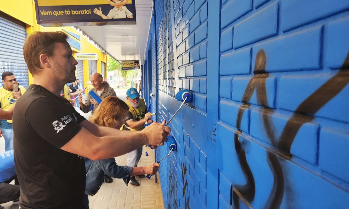 O prefeito de Joinville, Adriano Silva, e o empresário Luciano Hang participaram neste sábado, 15, de um mutirão de combate às pichações no Centro da cidade. A ação reuniu também a vice-prefeita Rejane Gambin, servidores municipais, integrantes do 62º Batalhão de Infantaria do Exército e dezenas de voluntários.