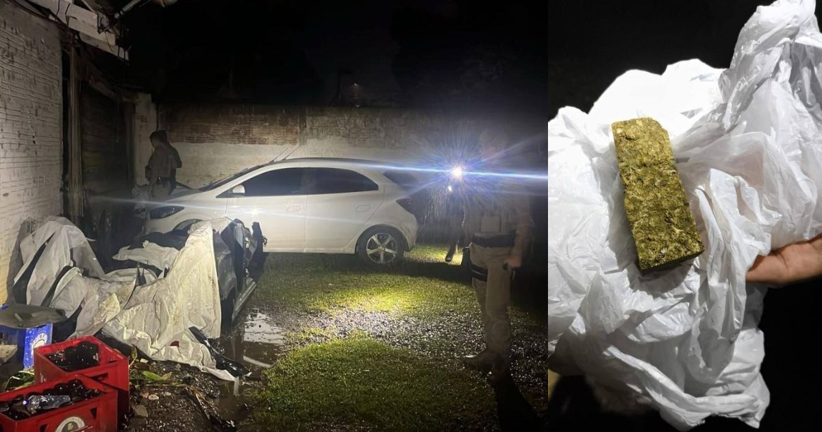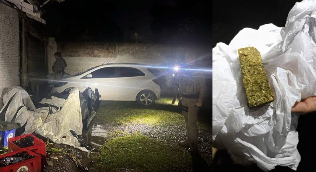 No imóvel, foram apreendidas duas placas utilizadas em adulteração, cerca de 50 gramas de substância semelhante à maconha e um chassi de veículo com registro de furto/roubo. Peças de veículos desmanchados também foram encontradas e fotografadas conforme orientação da PM.