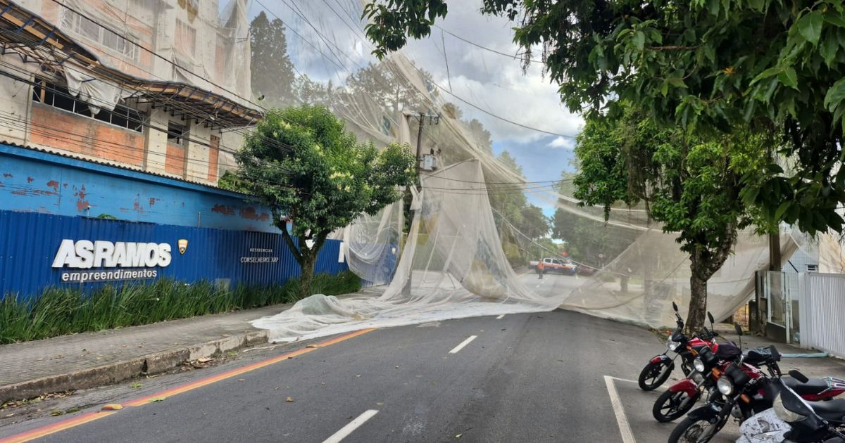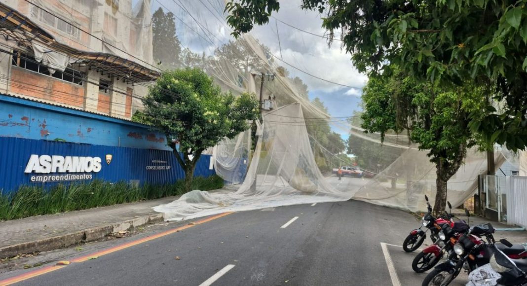 Vento forte derruba rede de proteção de prédio em obras e interdita rua em Joinville
