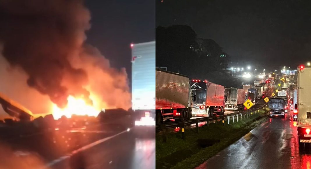 O caminhão que pegou fogo atingiu a estrutura de um radar. Depois, outro caminhão, carregado com telhas, bateu no primeiro. Um terceiro, que vinha da direção oposta, acabou batendo nos outros dois.