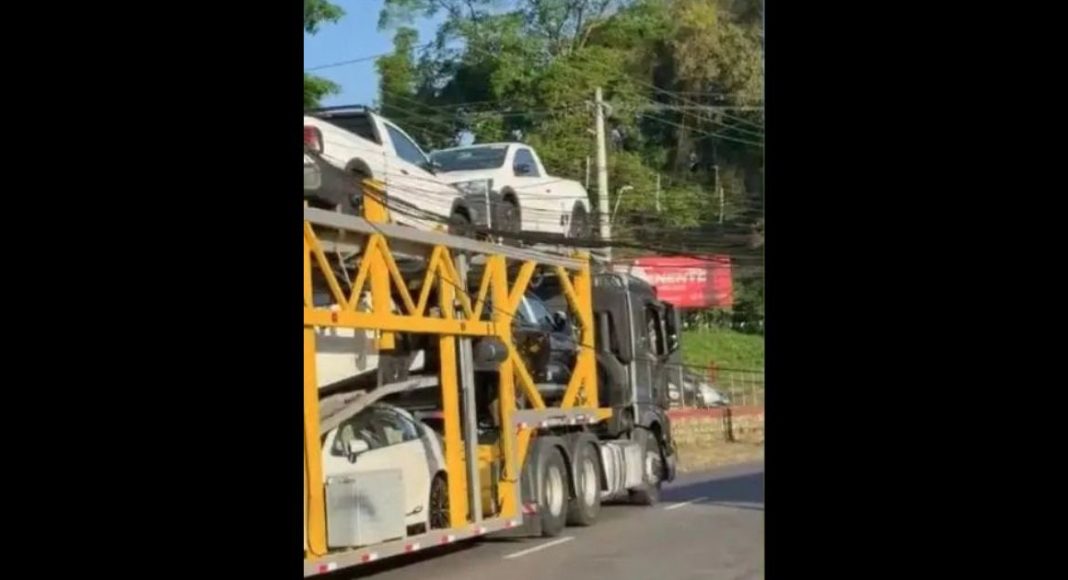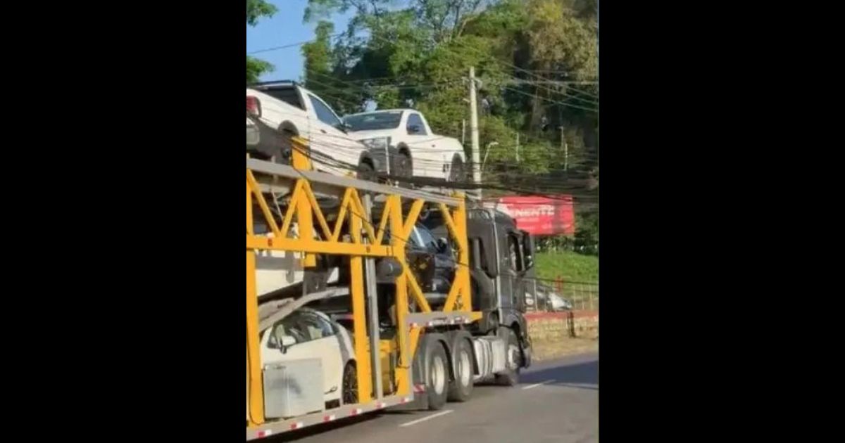 Um vídeo compartilhado pelas redes sociais mostra o caminhão, que estava levando outros veículos, enroscado em fios e um poste tombado. As imagens também revelam o início de um congestionamento na via.