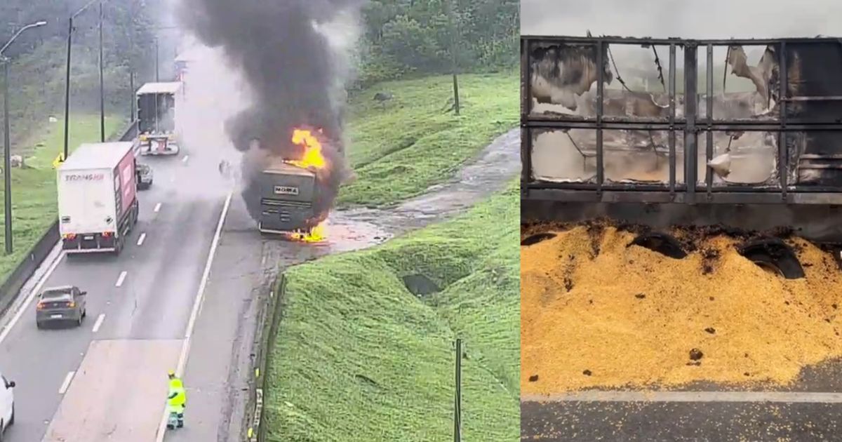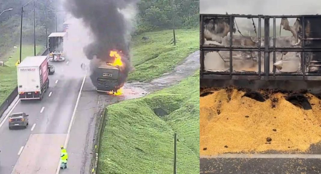 VÍDEO – Carreta carregada de grãos de milho pega fogo na BR-376, em Garuva